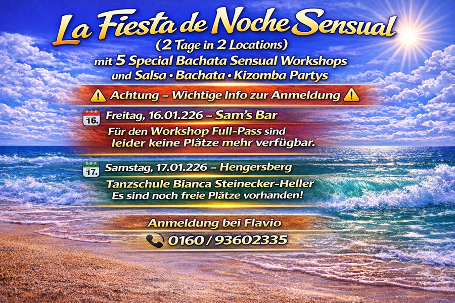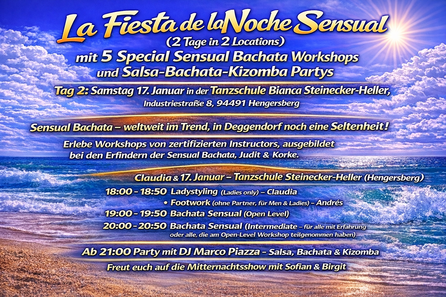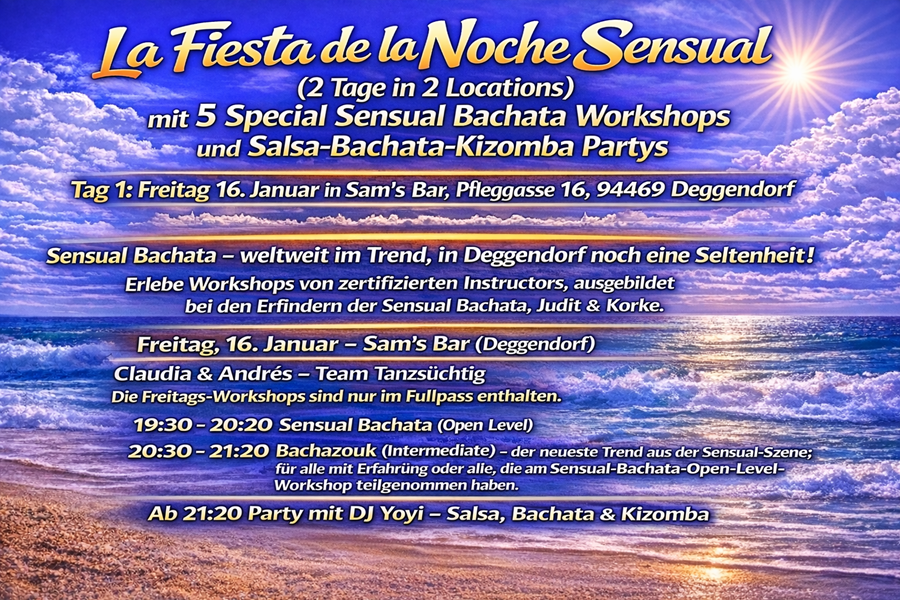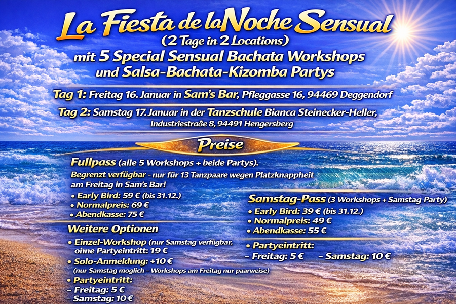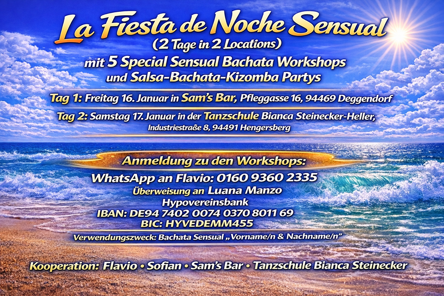 ![]() ![]() ![]() ![]() ![]() La Fiesta de la Noche Sensual (2 Tage in 2 Locations) mit 5 Special Sensual Bachata Workshops und Salsa-Bachata-Kizomba Partys Tag 1: Freitag 16. Januar in Sams Bar, Pfleggasse 16, 94469 Deggendorf Tag 2: Samstag 17. Januar in der Tanzschule Bianca Steinecker-Heller, Industriestraße 8, 94491 Hengersberg Sensual Bachata weltweit im Trend, in Deggendorf noch eine Seltenheit! Erlebe Workshops von zertifizierten Instructors, ausgebildet bei den Erfindern der Sensual Bachata, Judit & Korke. Freitag, 16. Januar Sams Bar (Deggendorf) Claudia & Andrés Team Tanzsüchtig Die Freitags-Workshops sind nur im Fullpass enthalten. 19:30 20:20 Uhr Sensual Bachata (Open Level) 20:30 21:20 Uhr Bachazouk (Intermediate) der neueste Trend aus der Sensual-Szene; für alle mit Erfahrung oder alle, die am Sensual-Bachata-Open-Level-Workshop teilgenommen haben. Ab 21:20 Party mit DJ Yoyi Salsa, Bachata & Kizomba Samstag, 17. Januar Tanzschule Steinecker-Heller (Hengersberg) Claudia & Andrés Tanzsüchtig Linz 18:00 18:50 Uhr Ladystyling (Ladies only) Claudia Footwork (ohne Partner, für Men & Ladies) Andrés 19:00 19:50 Uhr Bachata Sensual (Open Level) 20:00 20:50 Uhr Bachata Sensual (Intermediate für alle mit Erfahrung oder alle, die am Open-Level-Workshop teilgenommen haben) Ab 21:00 Party mit DJ Marco Piazza Salsa, Bachata & Kizomba Freut euch auf die Mitternachtsshow mit Sofian & Birgit Preise Fullpass (alle 5 Workshops + beide Partys). Begrenzt verfügbar nur für 13 Tanzpaare wegen Platzknappheit am Freitag in Sams Bar! Early Bird: 59 € (bis 31.12.) Normalpreis: 69 € Abendkasse: 75 € Samstag-Pass (3 Workshops + Samstag-Party) Early Bird: 39 € (bis 31.12.) Normalpreis: 49 € Abendkasse: 55 € Weitere Optionen Einzel-Workshop (nur Samstag verfügbar, ohne Partyeintritt): 19 € Solo-Anmeldung: +10 € (nur Samstag möglich Workshops am Freitag nur paarweise) Partyeintritt: Freitag: 5 € Samstag: 10 € Anmeldung zu den Workshops: WhatsApp an Flavio: 0160 9360 2335 Überweisung an Luana Manzo Hypovereinsbank IBAN: DE94 7402 0074 0370 8011 69 BIC: HYVEDEMM445 Verwendungszweck: Bachata Sensual "Vorname/n & Nachname/n" Kooperation: Flavio Sofian Sams Bar Tanzschule Bianca Steinecker Heller |